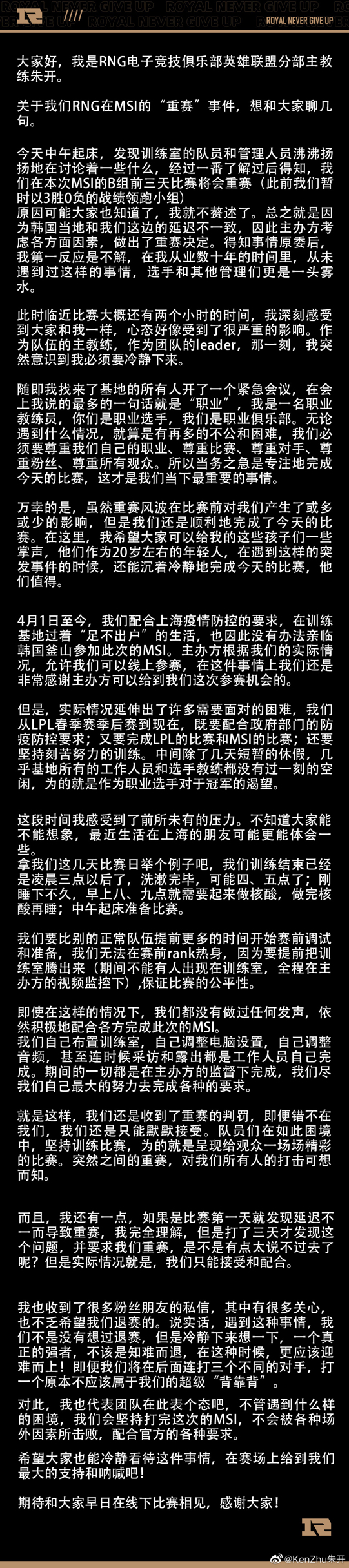 RNG主教练朱开在知道这件事之后也是发长文作出回应,之前很多观众都喜欢调侃朱开教练为世一汤,看完他的长文之后感觉朱开是正能量满满的世一汤,因为韩国当地和RNG的延迟不一致,所以官方临时决定重赛,在临近比赛两个小时的时候听到这个消息对选手产生很大的影响,世一汤临时开会告诉队员他们是职业选手,要尊重比赛尊重对手尊重所有的观众,在安抚完选手之后朱开明确解释了为什么线上才赛,从4月1号开始RNG基地就过着足不出户的生活,是主办方给了他们线上参赛的机会。