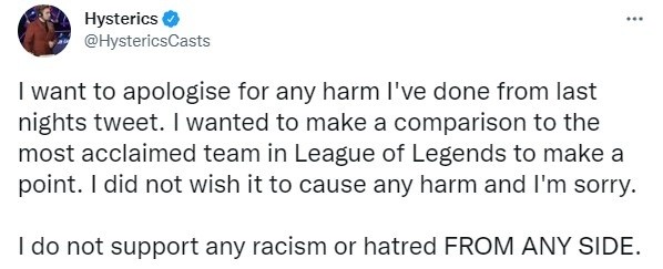 由于LPL英文流解说在外网力挺RNG,因此也是引发了RNG阵营和反RNG阵营的争吵,对此LPL英文流解说不得不致歉:“我想为昨晚发文造成的伤害说一声抱歉,我只是想用最受欢迎的两支队伍做个对比来发表我的观点。并非想造成任何伤害,很抱歉,我不支持任何一方的种族歧视和仇恨言论。”