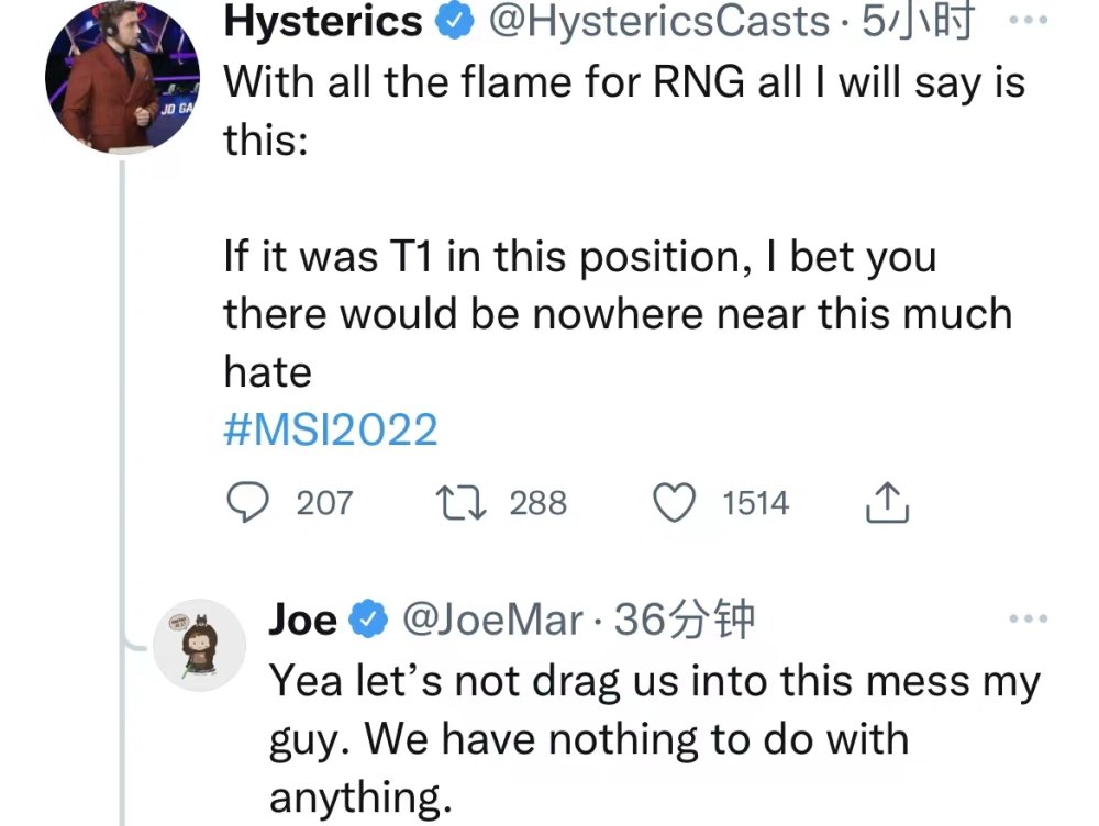 这个时候LPL英文流解说坐不住了,他发推力挺RNG:“针对目前RNG受到的所有攻击言论,我只想说如果把这个情景下RNG换成T1,我敢笃定网上不会有这么多的反感情绪。”他的意思就是如果线上参赛的是T1,被迫重赛的也是T1,那么网上不会有这么多人质疑T1是特权队。毕竟T1的海外粉丝比RNG多,所以大家对T1的包容性更强