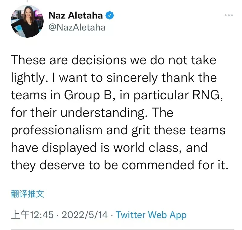 尽管重赛这个决定让RNG不能够理解,但RNG还是接受了。并且在小组赛第二轮表现不错,取得了3-0的战绩。在B组小组赛第二轮结束后,拳头游戏英雄联盟电竞赛事全球负责人Naz Aletaha回应重赛风波:我要衷心感谢B组的所有队伍,尤其是RNG,感谢他们的理解。他们展现出了顶级的职业竞技精神和坚持,值得我们称赞。然而,这个负责人只是感谢了RNG,并没有向RNG表达歉意,对于这个决定给RNG造成的负担只字未提。