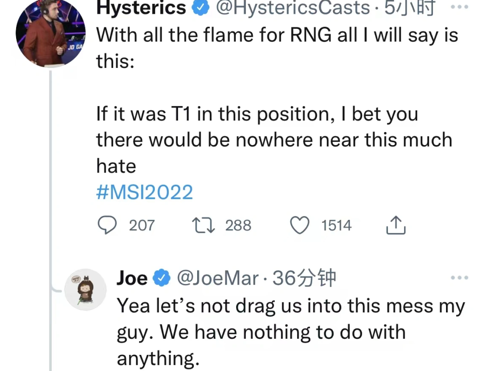 RNG重赛,在国外也是有许多网友表示不理解的。其中LPL英文流解说Hysterics发文称,“针对目前所有攻击RNG的言论,我只想说:如果今天是T1遇见这种事情,我打赌不会有这么多的反感情绪。”而这个解说的言论也得到了T1.CEO Joe的回复,大意是:“请不要把我们拖进这个烂摊子,这和我们毫无关系。”