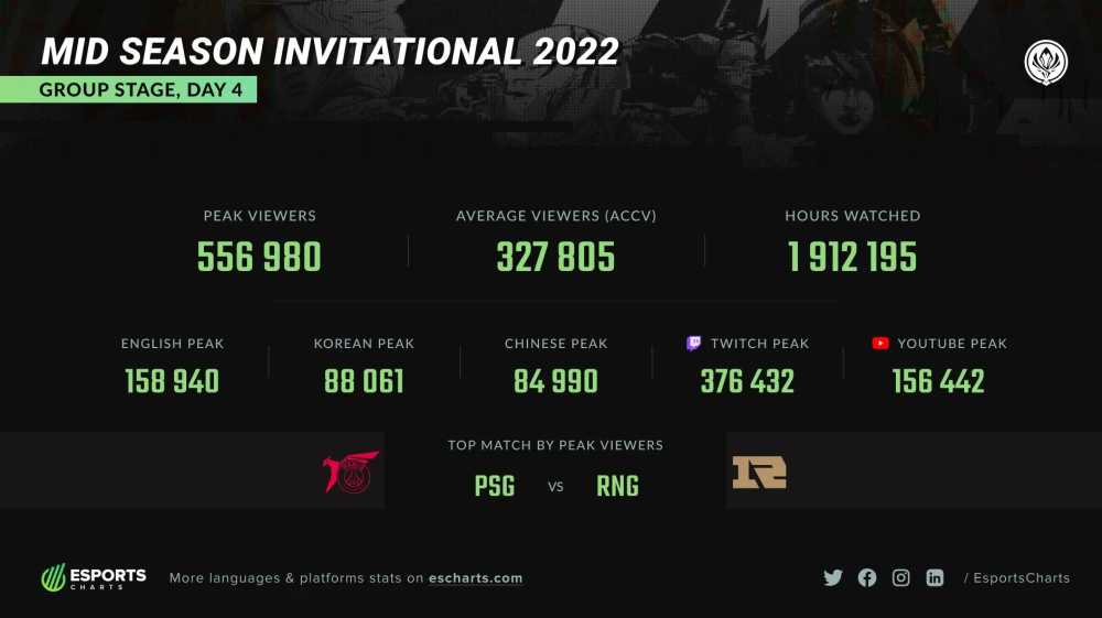 前言:这次MSI可谓是场外事不断,而“RNG重赛”这件事更是引发了巨大的舆论浪潮。然而,RNG明明是受害者,却成了大家指责的对象。也因为场外事太多,让许多观众失去了观看这次MSI的欲望。国外数据统计网站Esports Charts的数据显示,2022MSI小组赛第四日的观众峰值为55万6980。该数据不包括中国大陆直播平台数据。而这一数据相比第三天818636的观众峰值下跌32%。此外在平均观众人数和观看时长相比第三天的数据也有不同程度的下滑。