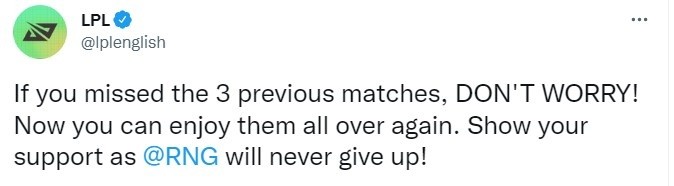 而LPL官方推特更新并为RNG加油,配文:如果您之前错过了RNG的3场比赛,不要担心!因为现在您可以再次享受它们。感谢您的支持,RNG永不言弃!
