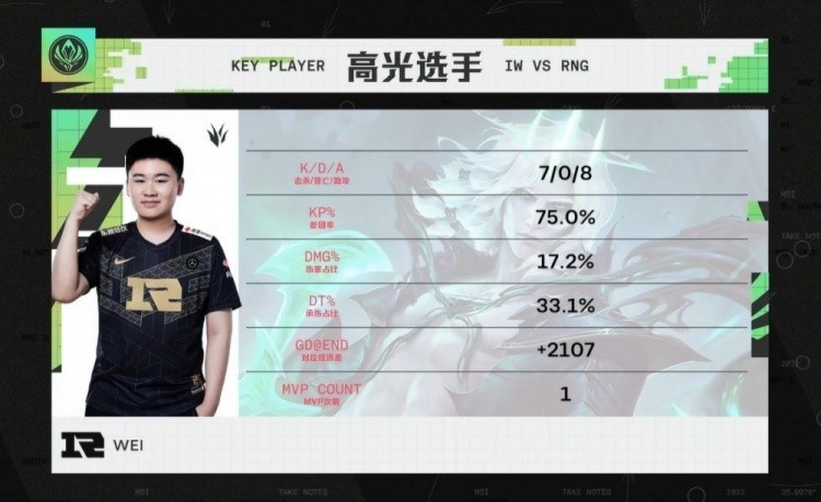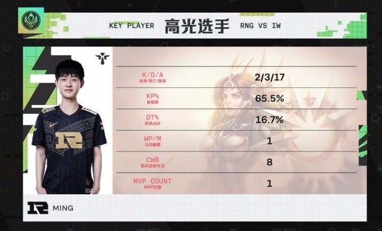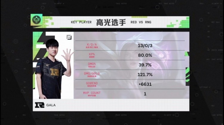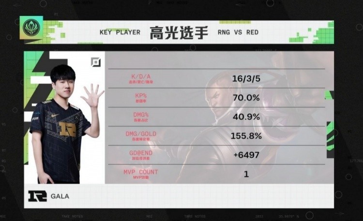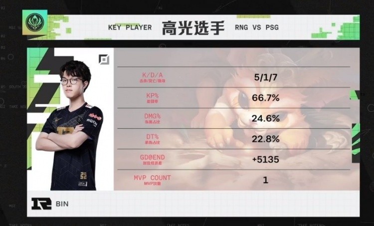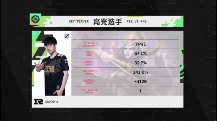 在RNG击败PSG拿下比赛胜利,Xiaohu使用妖姬拿下了本局MVP。截止目前为止RNG的五名首发均拿下一次MVP,GALA两次五杀取得两次MVP。