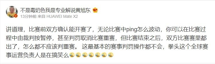 此外KenZhu也提出了疑问:如果比赛第一天发现延迟不一而导致重赛可以接受,但是打了三天才发现问题并要求重赛是否有点太说不过去了。
