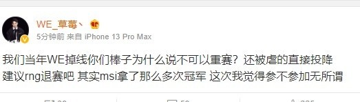 此事件一出,国内的众多电竞从业者纷纷对RNG表示不满,并力挺RNG WE的名宿草莓锐评:我们当年WE掉线你们棒子为什么说不可以重赛?这MSI不去也罢!而在当年龙争虎斗杯上,WE交手韩国战队KTA,在频繁掉线的情况下,WE依然血虐取胜,微笑飞机斩获五杀,草莓更是使用奥拉夫在高地跳舞,随后KTA投降。