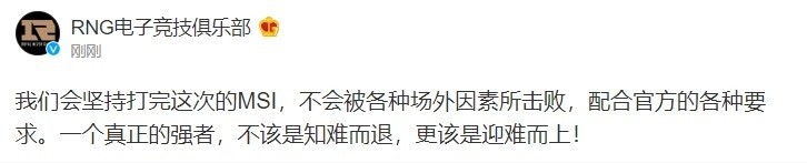 而RNG官方更新消息,宣布会坚持打完本次MSI赛事,不会被各种场外因素所击败!