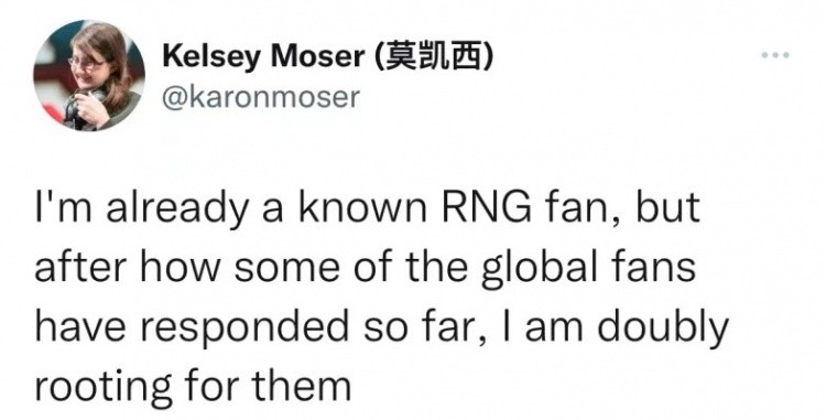 Kelsey Moser也发文力挺RNG,原文翻译如下: