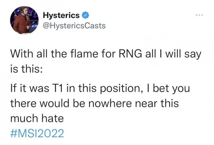 在赛后LPL英文流解说Hysterics以及Kelsey Moser也发文力挺RNG。LPL英文流解说Hysterics“针对目前所有攻击RNG的言论,我只想说:如果今天是T1遇见这种事情,我打赌不会有这么多的反感情绪。”