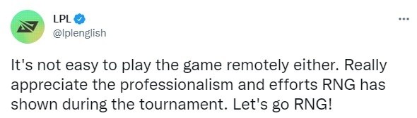 后续LPL官方转发该条推文,并为RNG加油:线上比赛并不容易,非常感谢RNG在MSI期间展现的专业精神以及为此付出的努力,加油,RNG!