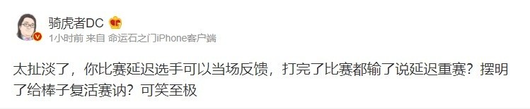而前d2官方解说DC也就此事件发博表态:太扯淡了,你比赛延迟选手可以当场反馈,打完了比赛都输了说延迟重赛?摆明了给棒子复活赛讷?可笑至极!