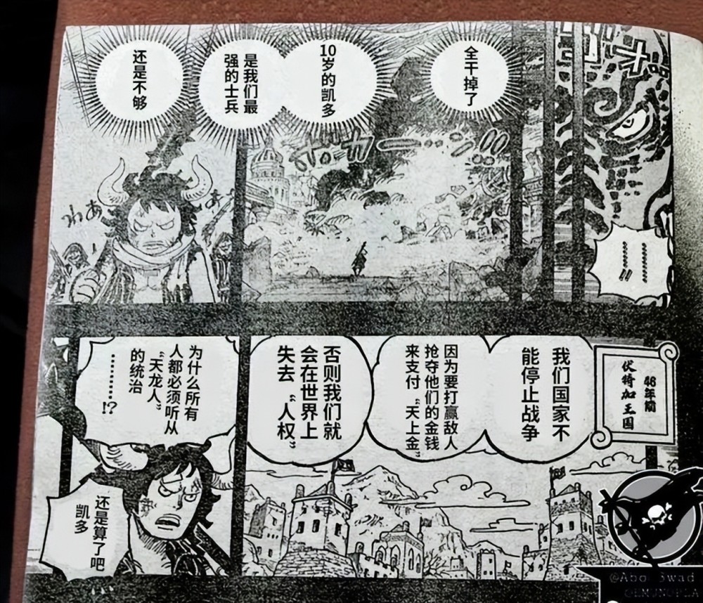 本话一开始讲述的就是凯多不怎么礼貌的一生,原来凯多这货从小也是生活在一个类似雇佣兵的国家,名为伏特加万国,一看就是战斗民族,所以常年做世界政府和其他国家的打手,一直也没有被世界所认同为一个国家,可能他们和奴隶也就差一线。