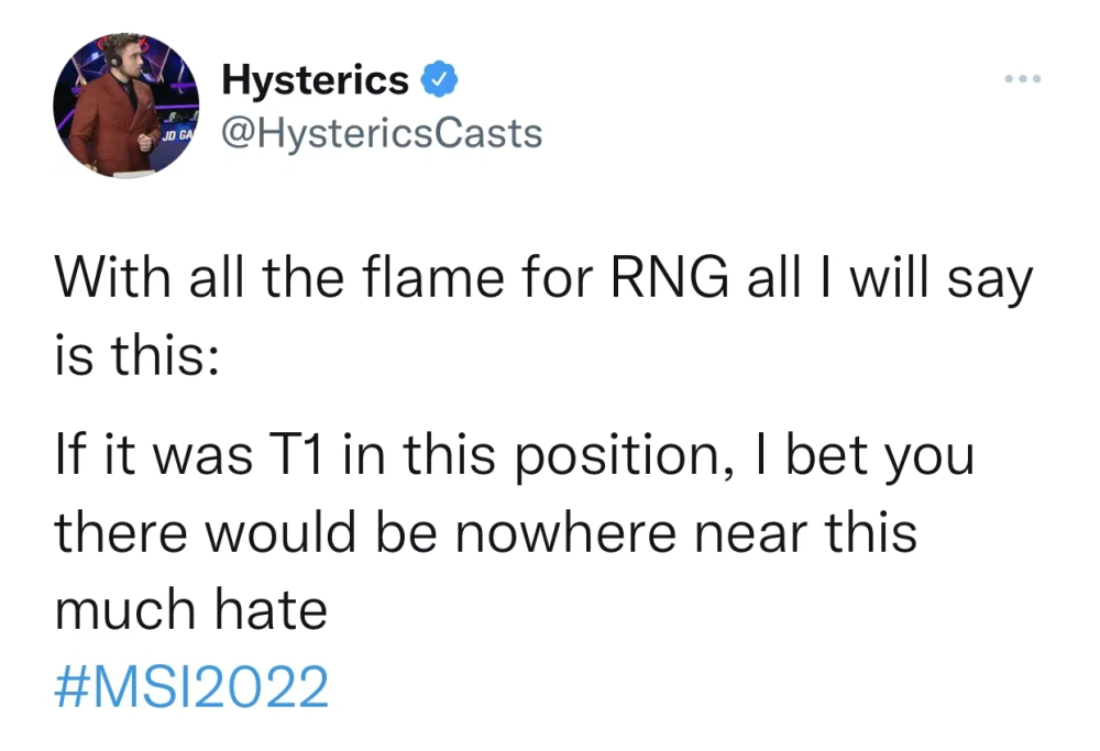 RNG被迫重赛,外网舆论净是幸灾乐祸,LPL英文流解说Hysterics并未就重赛的事多做讨论,而是为RNG遭受的反感情绪不平。
