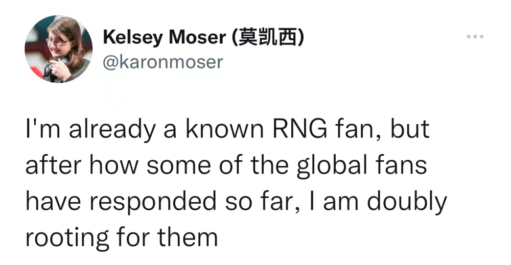与Hysterics一样,EG战队的分析师Kelsey Moser也对RNG表示支持,她先说明立场,是一个RNG的忠实粉丝,看到RNG目前遭受的处境,选择加倍支持。