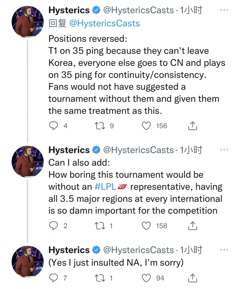 想象没有RNG参与的比赛,没有LPL的国际大赛,Hysterics明确表示那将会非常无聊,国际赛事就必须凑齐3.5个主要赛区,这对比赛很重要。