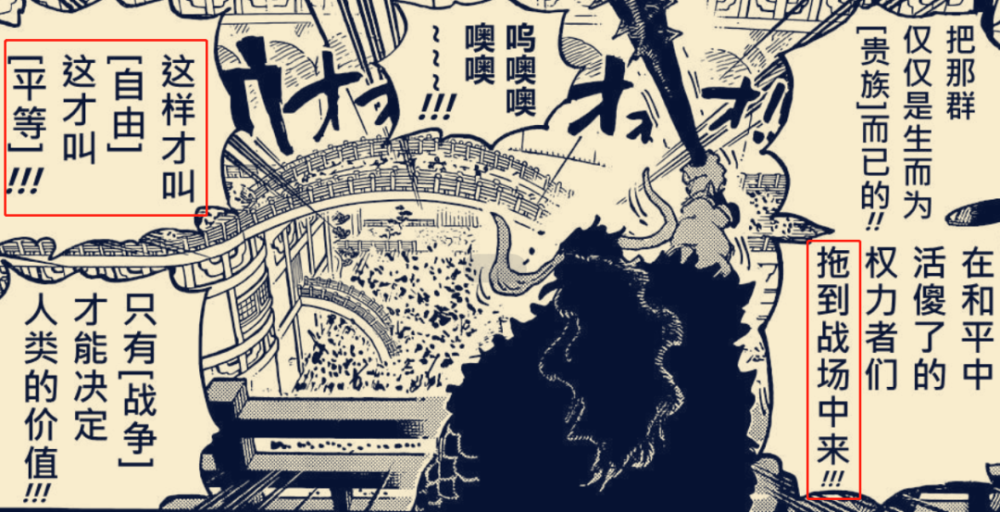 之后就是凯多在和之国的一系列行为,与大蛇联手对付御田,制作武器让世界充满战争,在凯多看来,所谓的自由与平等,就是把那些贵族拉到战场上来,因此他才制造大量武器,让世界动荡不安!