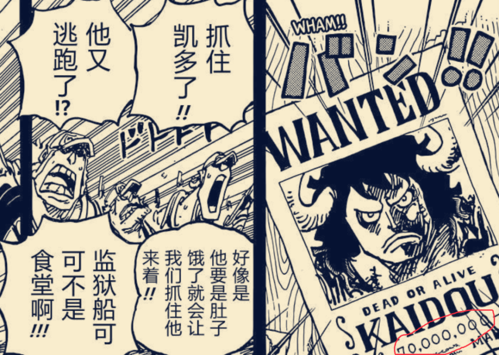 之后就是凯多与海军间的逃亡与抓捕,凯多多次逃离监狱,也多次被海军抓住,根据描述来看,凯多是因为肚子饿了就让海军抓他,吃饱后就越狱,而当时凯多因为多次越狱而被通缉,悬赏金为7000万贝利。