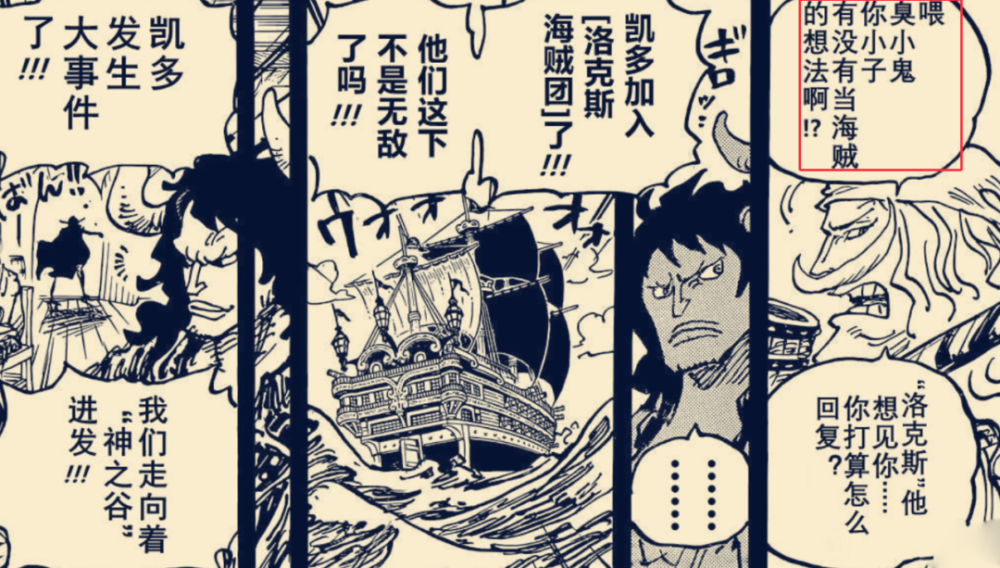 并且也表明洛克斯希望凯多加入进来,之后凯多加入了洛克斯海贼团,猜测可能是和洛克斯打了一架输了,然后加入,而当时加入洛克斯海贼团的强者有:白胡子、大妈、凯多,这三位未来成为四皇的人。