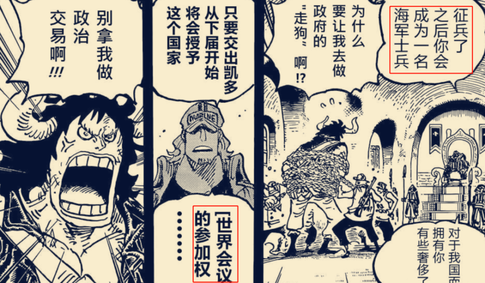 在凯多11岁的时候,被国王给出卖了,国王貌似因为凯多战力太强,把他交给了海军,而海军也表示,交出凯多能获得参加世界会议的权利,