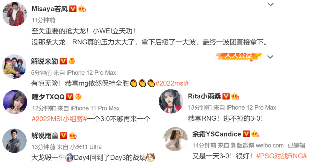 其实RNG这场打PSG的比赛压力还是蛮大的,对手更换首发上单以后不好处理了,吸血鬼玩得太油滑了,BIN刀妹一直打不穿对方的防线。如果WEI没抢掉那条大龙,说不定RNG真有可能翻车!但最终结果还是好的,RNG战队再次取得3-0全胜战绩证明自己,LPL解说纷纷发言恭喜,一个3:0不够就再来一个!