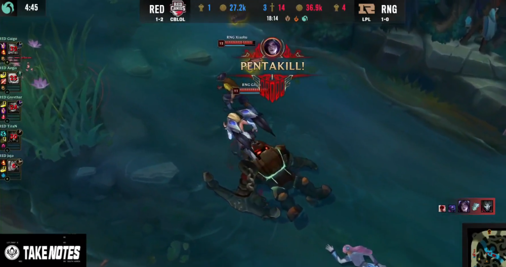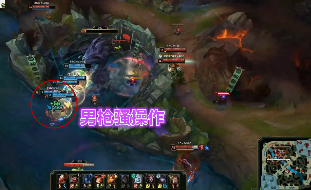 第三场比赛RNG面对老冤家PSG陷入开赛以来的第一场苦战,前期劣势没啥节奏,尽管拿到三条小龙,但打团胜率还只是五五开,阵容不是很好配合。直到PSG男枪打大龙的时候搞出骚操作,在大龙九百血的时候放出大招,自己却被后坐力轰出龙坑,再想往前滑步交惩戒的时候已经晚了,RNG佛耶戈入场抢掉大龙,中断了对手的进攻节奏!