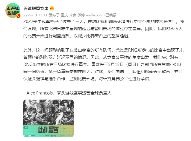 5月13日, 2022MSI季中冠军赛进行到第四天,RNG在小组赛第一轮打出了3-0的全胜战绩,出线形势一片大好,而就今日官方却突然发布了一个让许多LPL粉丝都极为震惊和愤怒的消息,宣布MSI中RNG参与的三场小组赛将全部进行重赛。