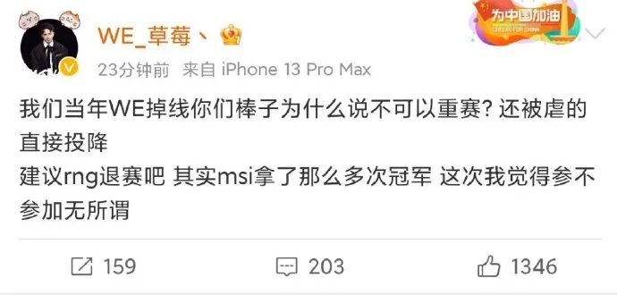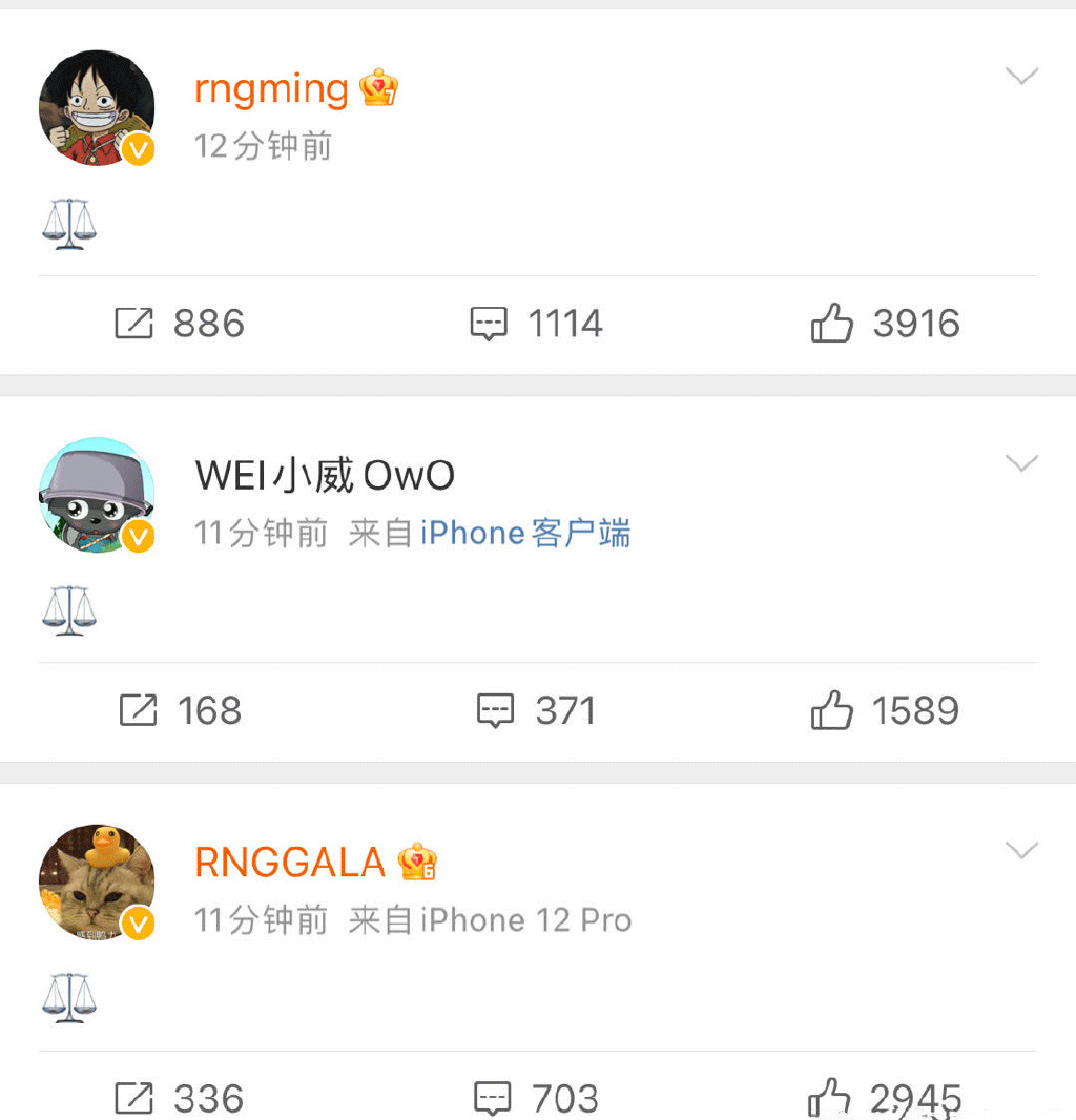 或许是因为接到了重赛的要求,RNG选手、教练和俱乐部管理组也在第一时间纷纷发布微博,虽然只是一个“天平”的表情,似乎都在暗示这一决定并不公平,俱乐部运营负责人所说的“配合”也打上了引号,大家对这个决定和结果都是不满且无奈的。
