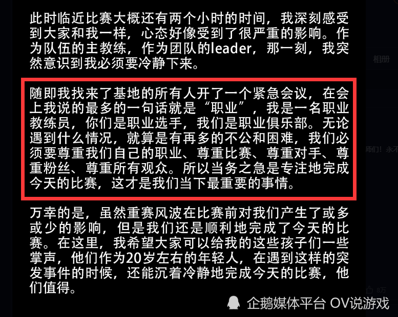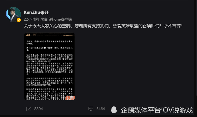 因为在宣布重赛之前RNG已经三战全胜,小组第一,突然宣布重赛对RNG后续的比赛状态和心态都会造成影响。但是RNG的朱开教练说的那样,他们是职业选手、职业俱乐部,尊重职业、尊重比赛、尊重对手,最重要的是尊重粉丝和观众。RNG今天用最好的表现告诉所有人“他们做到了”!