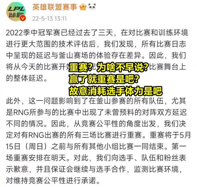 而且即便要重赛,为何不早说?非得等选手打完三场比赛再重赛,LPL选手不仅需要额外消耗大量体力,万一出了什么意外,还可能暴露战术。LPL玩家们纷纷开启了“嘲讽模式”,一个名叫“40年后的msi还在重赛”的调侃,登榜热搜。