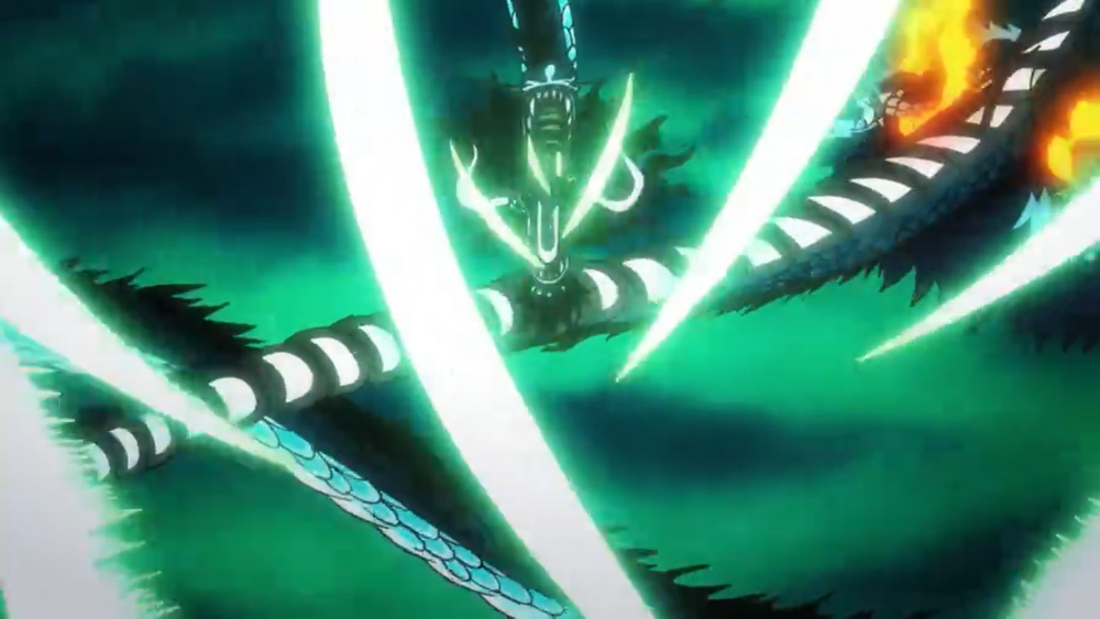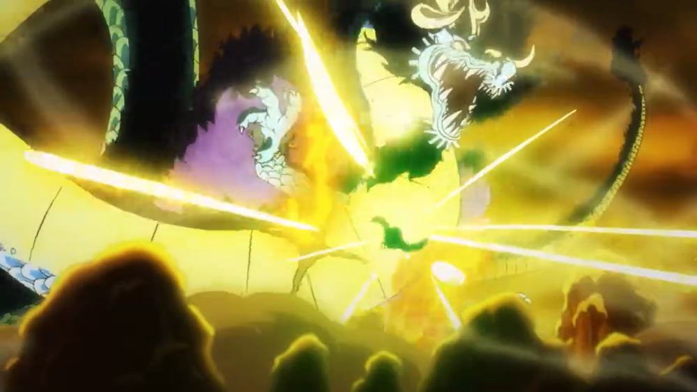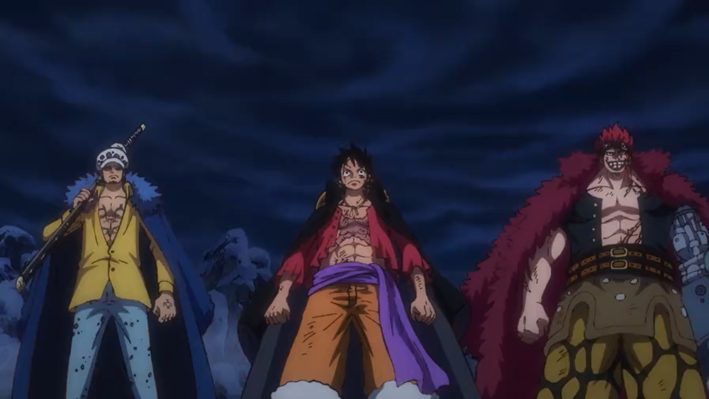 本话改编自漫画第1001话后半段,以及1002话一整话,也就是说,这一集相当于漫画一话半。因为剧情充实,也就没有之前那么拖了。前半集是超新星三船长各自放大招挑战凯多,后半集则是双方互相攻守,以路飞的“猿王枪乱打”结束。