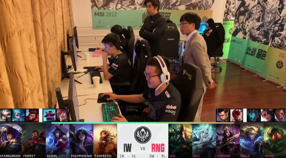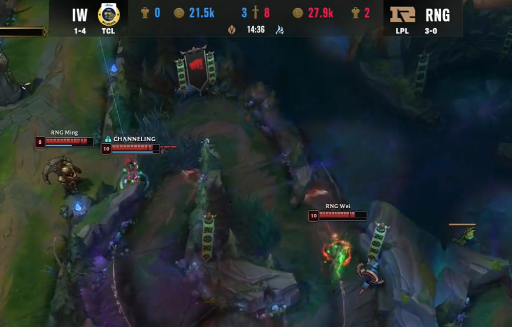 在BP阶段,RNG教练组启用中后期强势阵容,Bin锁下船长与IW上单盖伦对位,RNG中野由Xiaohu妖姬、Wei破败王组成,等待他们的是IW狐狸和野核男枪,再看下路,Gala再一次使用EZ搭配小明的招牌泰坦,破釜沉舟的IW用卡莎和蕾欧娜应对。
