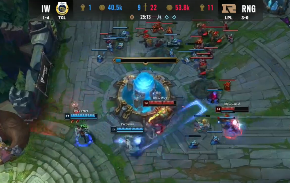 由于优势太大,RNG众将击杀落单的IW野核男枪后,无压力收下大龙。带着大龙Buff,RNG集结五人之力进攻IW高地,莽撞开团的蕾欧娜被秒,Gala探险家和Bin船长打出满额输出,由RNG打出一波1换4,进一步扩大经济差。