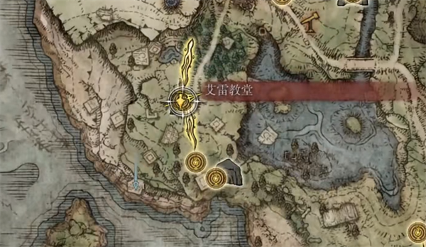 1、阔剑的位置在艾雷教堂的南方,海岸洞窟的门口东南方向,下图蓝色标注点位置;