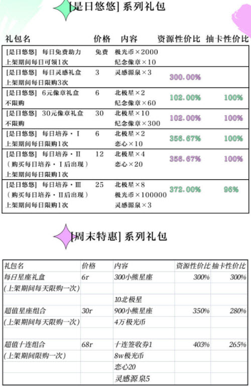 30r小月卡抽卡性价比为1380%,98r悦享卡(不进氪条)抽卡性价比为1163%。
