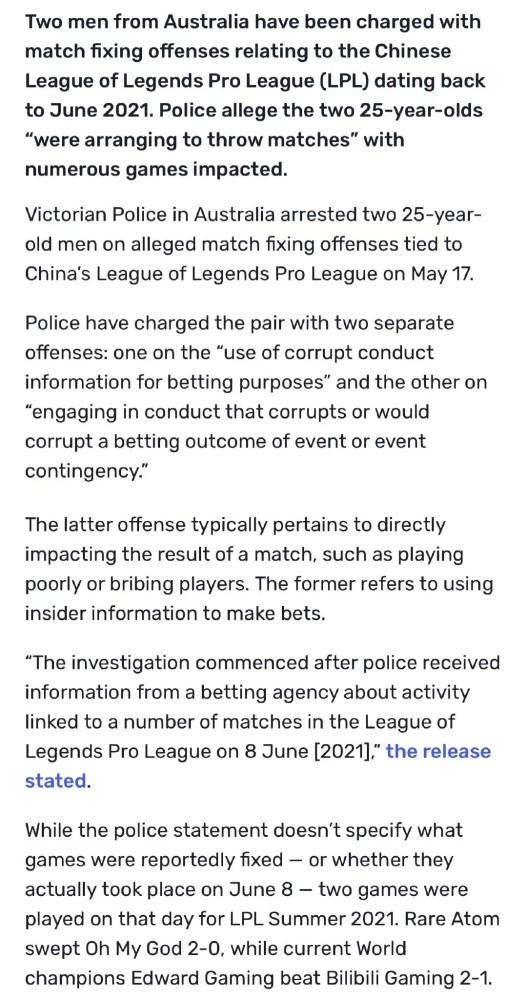 另一方面,近日关于LPL假赛风波再次推上风口浪尖。这个事件在这个时间点在外网公布,让人很意外,Ping值的问题才刚刚得到解决。据悉,外网记者爆料:澳洲警察抓捕了2位非中国籍男子,被指控参与了LPL职业联赛的假赛罪名。具体时间是2021年的6月8日,分别是RA战胜了OMG,以及EDG战胜了BLG。
