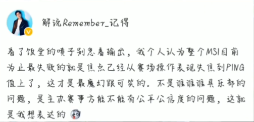 面对拳头的此番操作,远在北美的大师兄也是发文质疑拳头表示,此次MSI是不公平的比赛,并在直播时表示自己只是中立地评价了这件事。