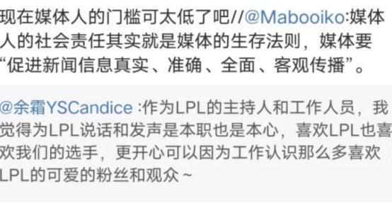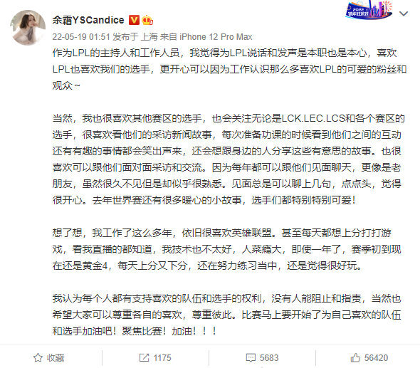 也是在余霜阿姨被冲后,深夜余霜更博回应了此事,余霜在更博中表示自己作为LPL赛区的主持人和工作人员,为LPL赛区发声是本职也是本心,喜欢LPL赛区的选手,更开心因为工作认识那么多喜欢LPL的粉丝和观众,而后余霜也是透露了对于英雄联盟这款游戏的热爱。