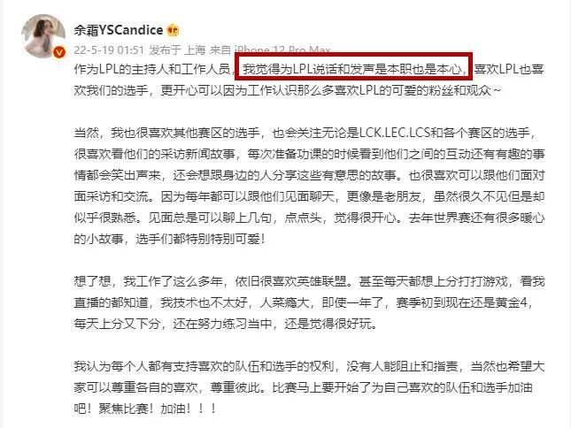 在诸多水友也翘首以盼MIS对抗赛的同时,有关于LPL知名主持人余霜的瓜吸引了海量水友的关注。凌晨,余霜发了一篇长篇博文。博文中余霜表达,身为LPL的主持人和工作人员,为LPL说话和发声是本职也是本心的事情。