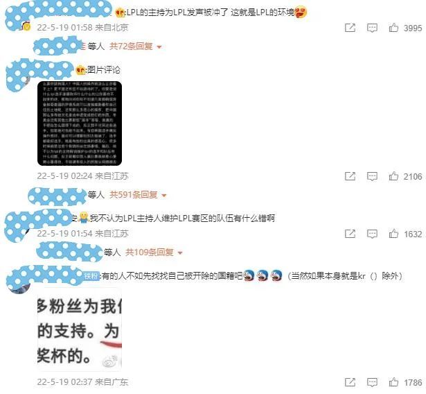 在此期间,余霜感谢了为LPL发声的英文流解说等等。总之,就是支持了一波RNG战队。对于海量的LPL玩家来说,是支持余霜这样的做法的。当然,也有部分水友认为余霜作为公众人物这样做法是不对的。然后,余霜的微博评论就有点“不能看了”。