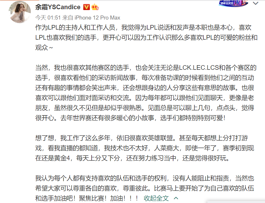 余霜在转发这条“MSI前三天线下场馆显示的延迟是35”的证据后,没想到评论区直接吵起来了。一边是为T1鸣不平的网友,他们认为这可以证明T1是被误会和冤枉的,另外一边是对此事持怀疑态度的网友。由于双方吵得不可开交,余霜不得不出来安抚:“每个人都有支持自己喜欢的队伍和选手的权利,希望大家可以尊重自己的喜欢,我作为LPL的主持人,为LPL发声是本职和本心。”