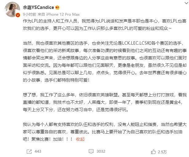 也许是被喷得太惨了,余霜在凌晨两点的时候又补发了一条微博,以此来表达自己的心声:作为LPL的主持人和工作人员,我觉得为LPL说话和发声是本职也是本心,喜欢LPL也喜欢我们的选手,更开心可以因为工作认识那么多喜欢LPL的可爱的粉丝和观众。可以看出,余霜对于我们LPL,包括粉丝和观众都是发自于内心的喜欢,当RNG遭受不公平待遇时,为其发声也绝对算是一种出于本心了。而正是这种出于本心的喜欢,遭到了其他战队粉丝的攻击和谩骂。