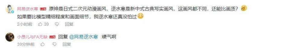 虽然审美标准因人而异,但是睁眼吹捧《原神》的言论,也让人分不清楚这些玩家是在引战还是单纯表达自己的看法。而这种充满争议的言论,也让很多网友们激动了起来,立即冲上前与其辩论,甚至连《逆水寒》官方都被惊到了,亲自下场表示:《原神》是日式二次元动漫画风,《逆水寒》手游是新中式古典写实画风,这画风都不同,画质什么的先放在一边。但如果要比模型精细程度和画面细节,我《逆水寒》还真没怕过!