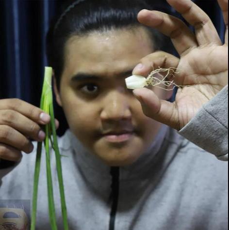 泰国小哥找来了两根葱, 将里面的两个小葱头拿出来。