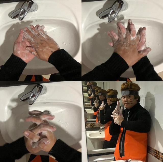 小哥来到洗手间,将洗手液均匀涂抹之后,使用影分身之术。