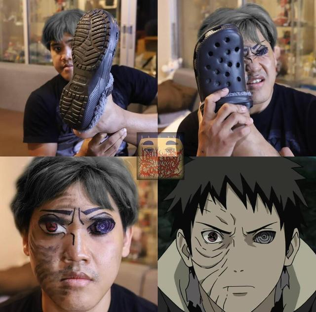 狗哥带土的半边脸毁容,为了还原这个细节,泰国小哥哥专门找来了一只鞋子。
