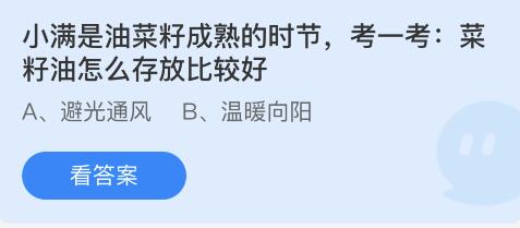 蚂蚁庄园5月21日给大家带来了问题:【小满是油菜籽成熟的时节考一考菜籽油怎么存放比较好?】,菜籽油存放是有技巧的,接下来小编给这个问题带来了答案,感兴趣的小伙伴一起来了解一下吧。