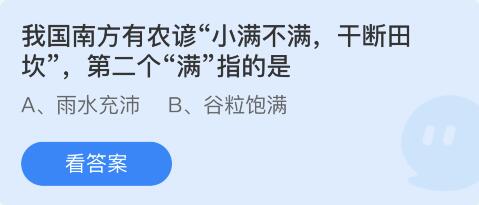 蚂蚁庄园5月21日给大家带来了问题:【我国南方有农谚“小满不满,干断田坎”,第二个“满”指的是?】,这句谚语有2个满字,接下来小编给这个问题带来了答案,感兴趣的小伙伴一起来了解一下吧。