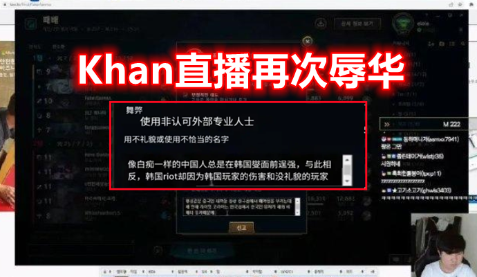 而Khan的辱华行为,已经不是第一次出现了,早在S8赛季,Khan就曾公开表示:四个中国人赢不了比赛,当时就引发了很大的舆论,遭到无数讨伐和举报之后,Khan最终公开道歉,并且剃光了自己的头发,后续还说出了五个中国人可以赢这样的话,作为已经遭到过处罚的选手,如今再次在直播中公开辱华中国玩家,甚至还AOE所有人,真的不是蠢就是坏了。
