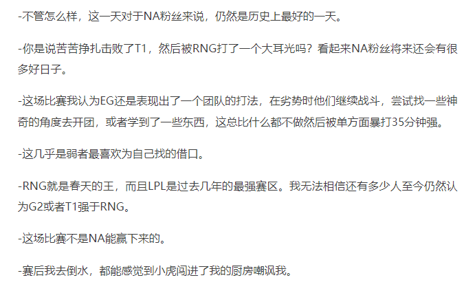 除此之外,还有外国网友表示至今还有人认为,T1或者G2要强于RNG,我不能明白他们究竟是怎么想的。他们一直都在吹T1或者说吹G2,但是在我看来,现在应该要吹的应该是RNG,他们打的那么好,居然还有人不看好他们,我真的是不能理解。外国网友的这番话说的则相对比较中肯,这可能也是他的心里话吧。
