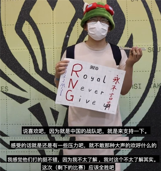 她说自己很喜欢RNG这支全华班,得知他们要来釜山打比赛,急忙赶来加油助威。因为来的RNG粉丝肯定很少,有人在现场也算一种鼓励。另一位男粉丝表示自己不太关注电竞比赛,只是听说有LPL队伍打比赛,前来支持一下。现场感觉很有压力,不敢大声欢呼。看来,LPL现场观众真的很少,RNG获胜这几个人都不敢喊话。